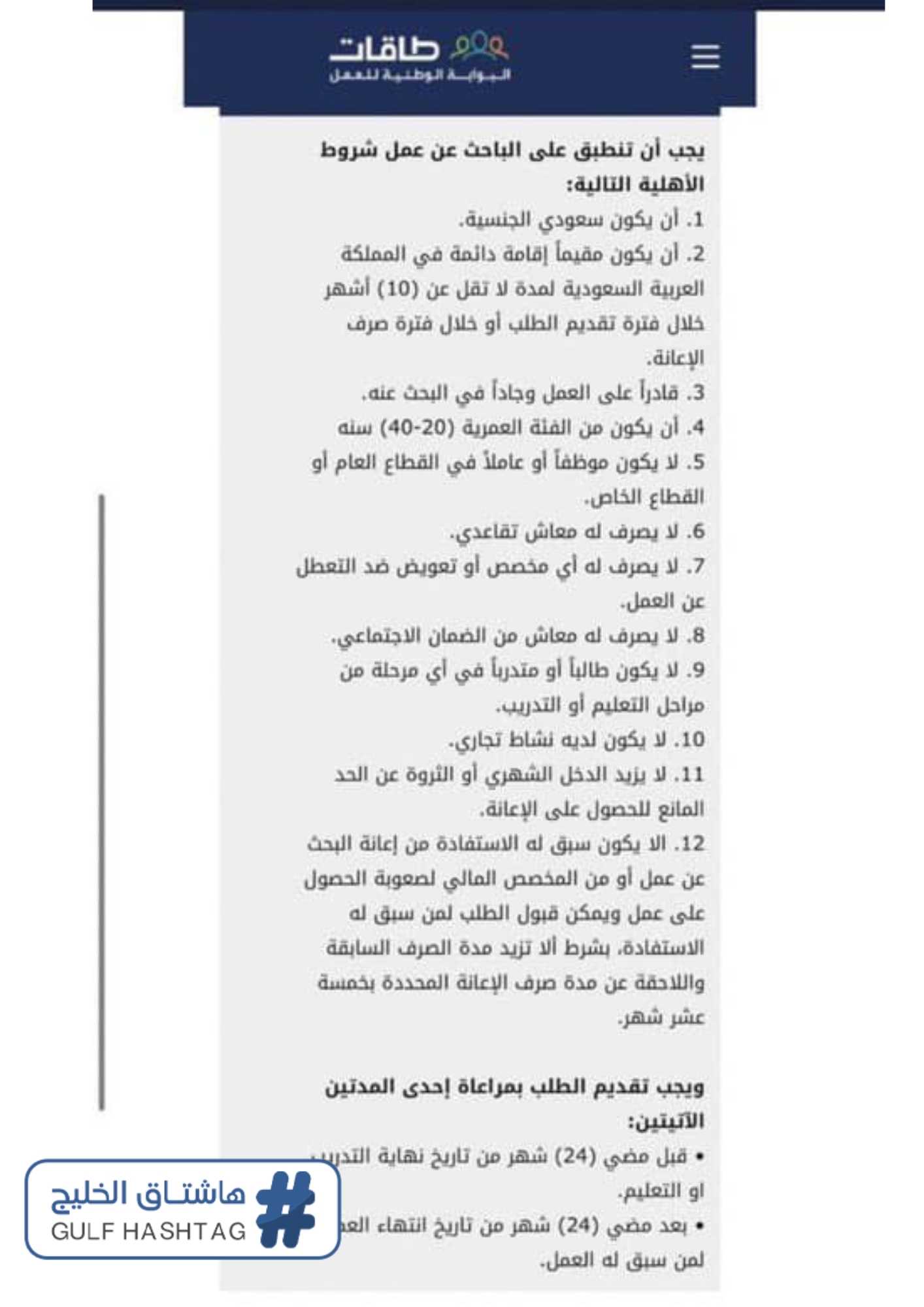 - ألَّا يكون من المستفيدين السابقين لإعانة البحث عن عمل أو المخصص المالي لصعوبة الحصول على عمل.