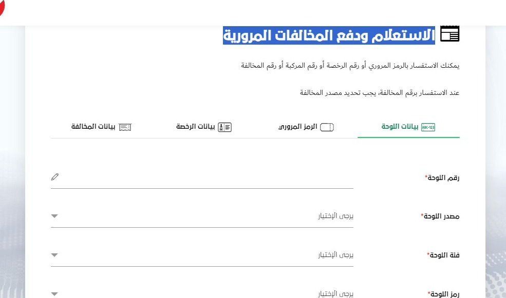- تحديد البحث عن المخالفة المرورية ببيانات اللوحة.